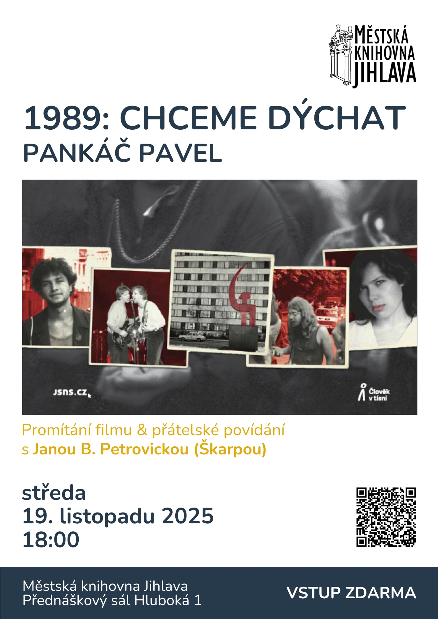 Po filmu si budeme povídat s Janou Bečkovou Petrovickou – Škarpou, výraznou osobností jihlavské punkové scény, která v té době žila své „malé velké revoluce“. Nebude to klasická beseda, spíš otevřené a přátelské setkání, kde se dotkneme nejen minulosti, ale i toho, jak se svoboda žije dnes.