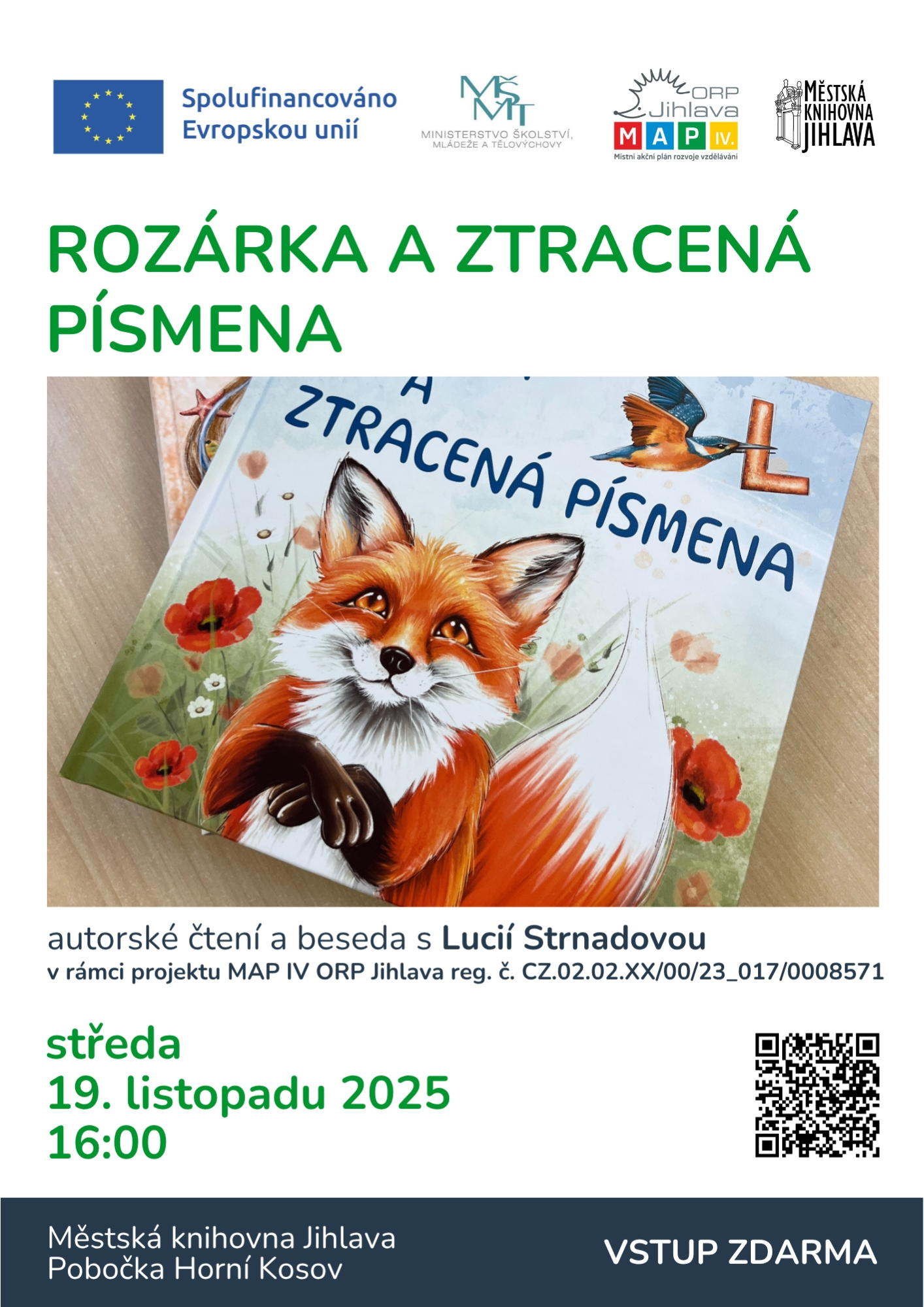 Autorské čtení a beseda s Lucií Strnadovou se koná v rámci projektu MAP IV ORP Jihlava reg. č. CZ.02.02.XX/00/23_017/0008571.