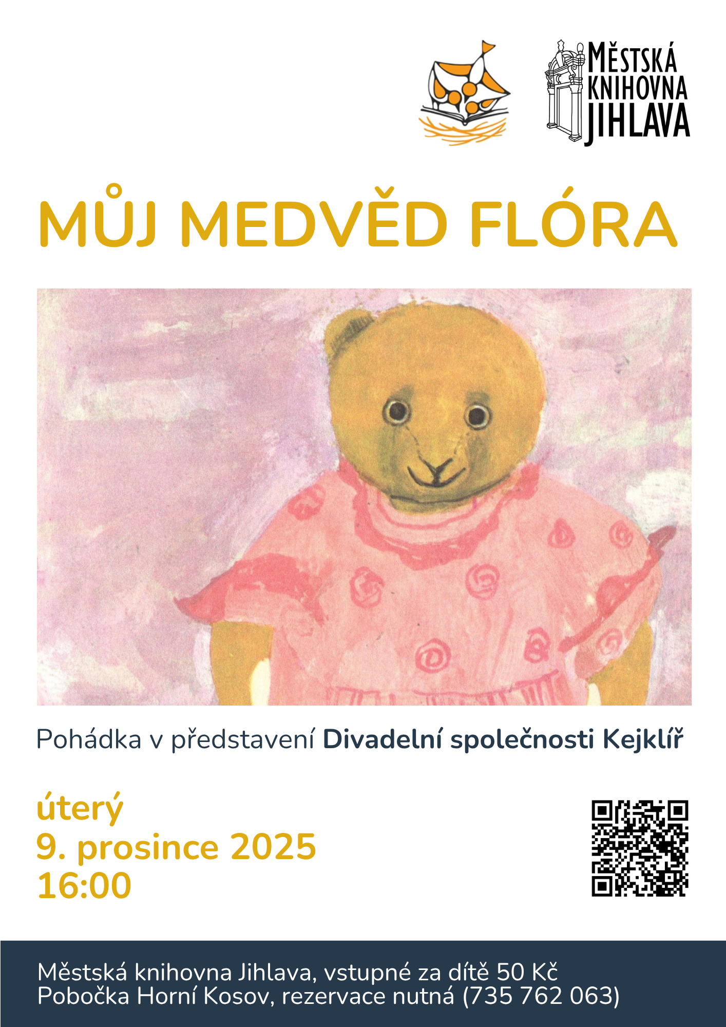 Zveme všechny malé diváky i jejich rodiče na poetické a hravé představení „Můj medvěd Flóra“, inspirované knihou Daisy Mrázkové o nalezeném medvídkovi.