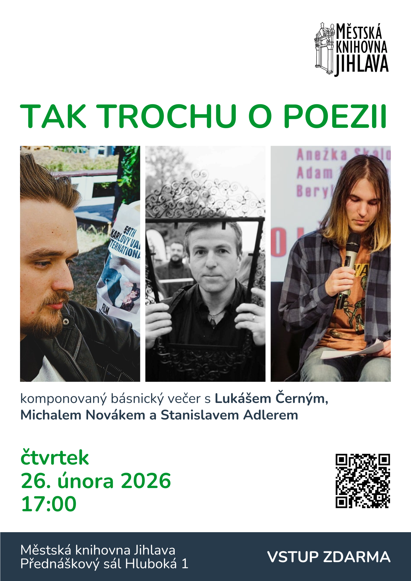 Tři autoři během tohoto večera přečtou ukázky ze své tvorby, které doplní prezentací o tom, jaká inspirační podhoubí je utvářela (90. léta, underground, Havel, Hrabal, Shakespeare, Rimbaud, E. A. Poe a další), co pro ně poezie představuje, kde všude se může nacházet a co jsou oni sami vlastně zač. Cílem večera je trochu se pozastavit, ponořit se do poezie z různých úhlů a něco se o ní snad i dozvědět.