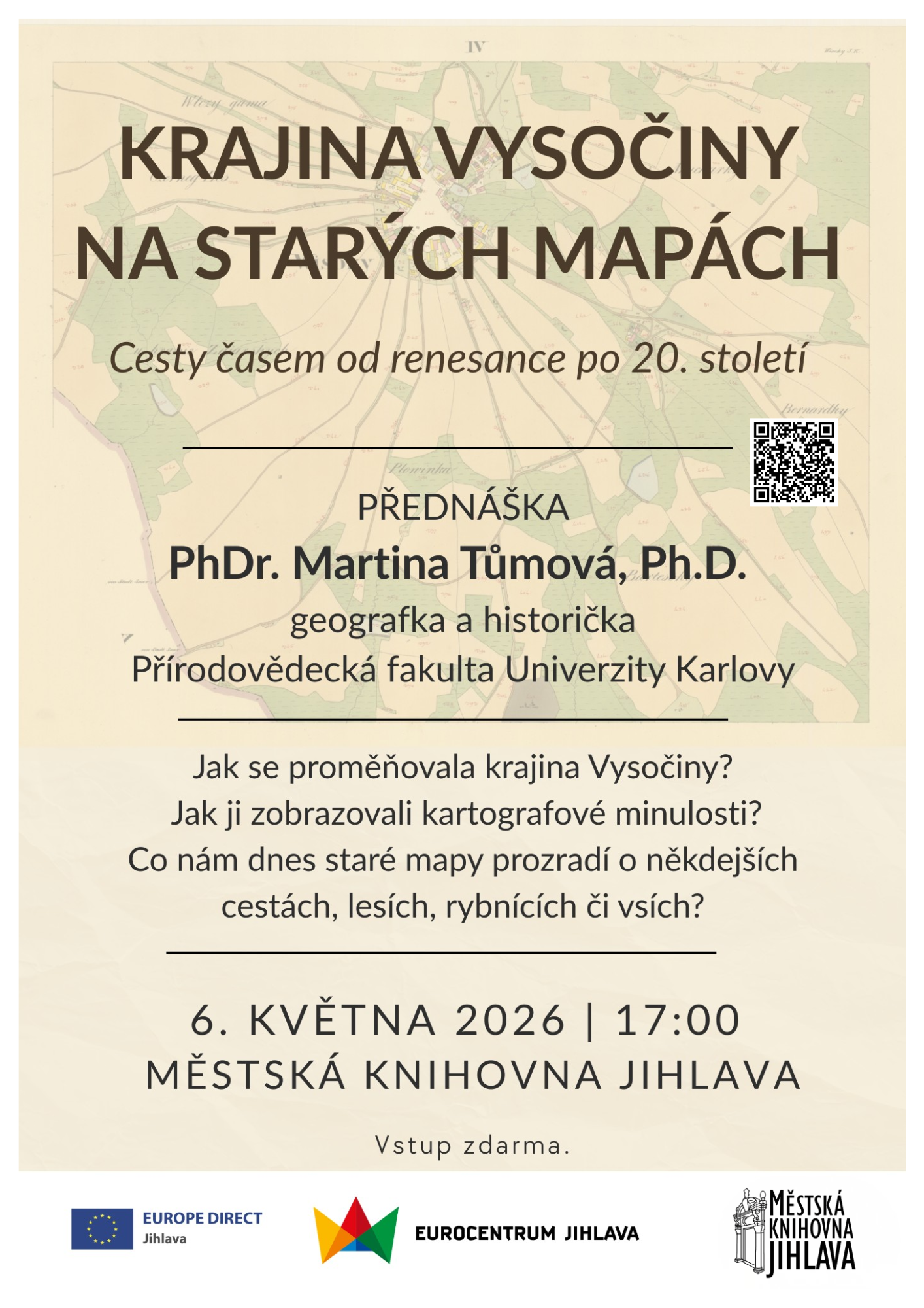 Jak vypadala krajina Vysočiny před dvěma či třemi staletími? Jak se od té doby proměnily vodní toky, vodní plochy, lesy i zemědělská půda nebo jak se rozvíjela jednotlivá sídla? To vše nám pomáhají odhalit staré mapy a plány. Mohou to zachytit mapovou kresbou nebo uměleckou výzdobou. Přednáška nám představí různé druhy starých map od 16. do 20. století. V nich si na příkladu Vysočiny ukážeme nejen krásu těchto historických pramenů, ale především širokou škálu informací, které nám při zájmu o historii, přírodu, krajinu a životní prostředí našeho kraje mohou nabídnout.
