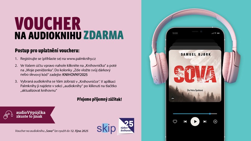 Máme pro vás malou pozornost – aby byl Týden knihoven ještě příjemnější. Každý čtenář si u nás může vyzvednout voucher na audioknihu Sova. Oblíbená severská krimi vás vtáhne do děje, ať už posloucháte doma, na cestách nebo třeba při vaření.